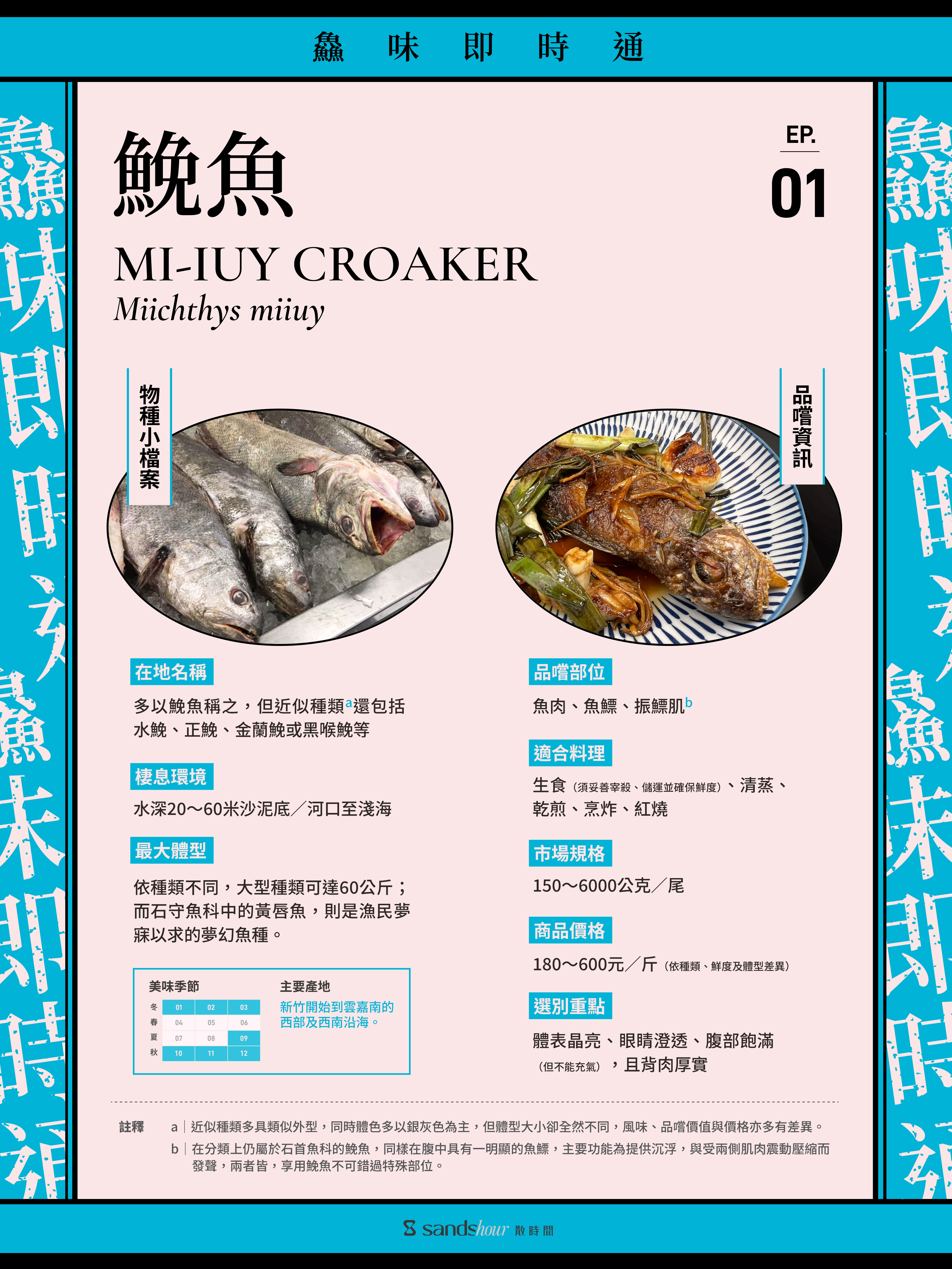 在養殖技術尚未建立,甚是至儲運與保鮮技術相對粗糙簡陋的早期,要吃到一條鮮度絕佳的鮸魚,可得付上昂貴代價。但為何人們對於鮸魚情有獨鍾?因為在美味魚鮮的排行中,多有「一午、二鮸、三嘉臘」,或是「一午、二紅衫、三鮸、四嘉鱲」的說法,顯見就算是所費不貲,也要嚐到這美妙風味,引人垂涎的美味及其特色可見一斑。
